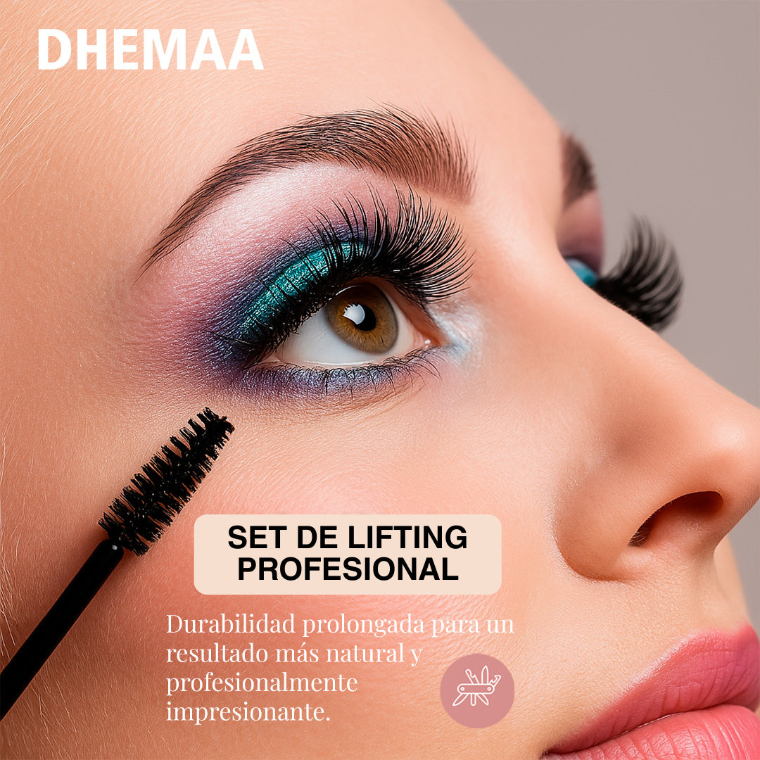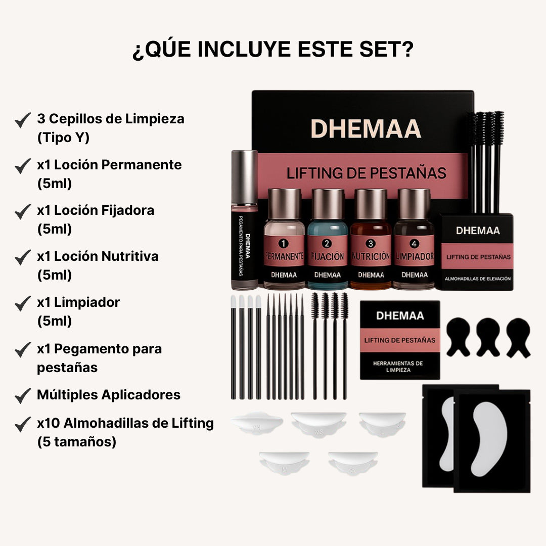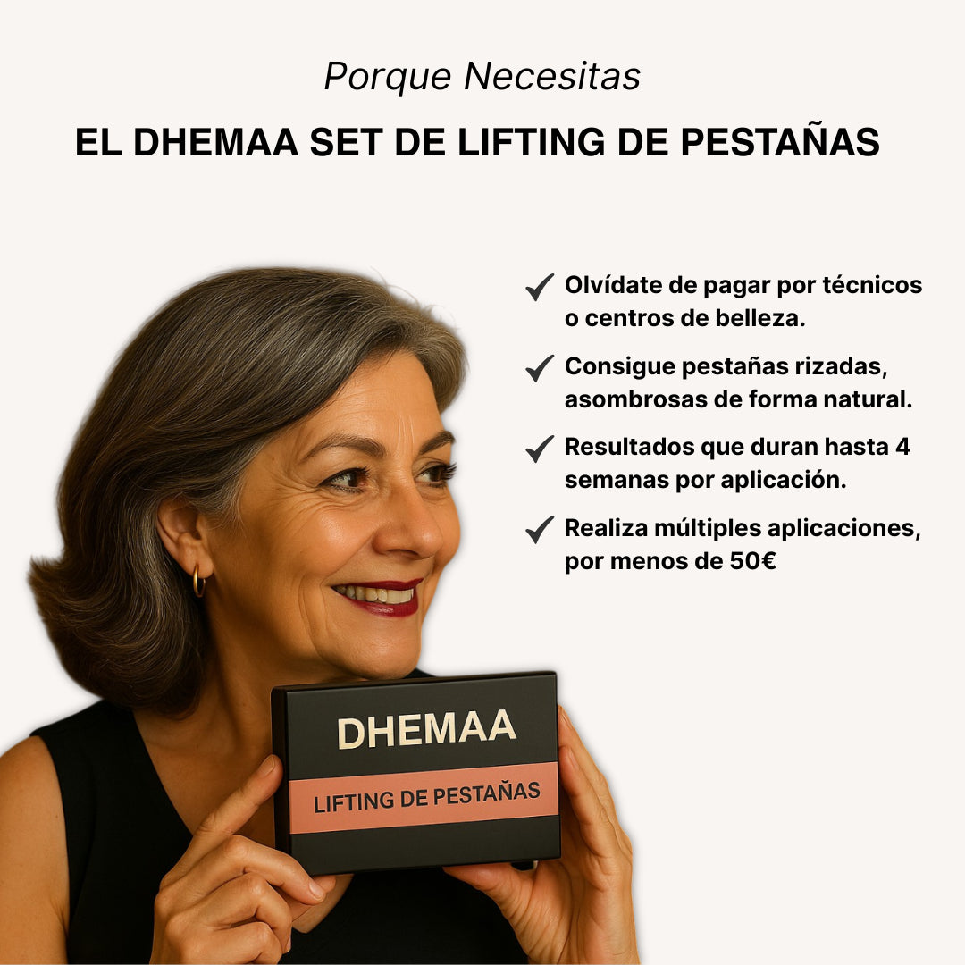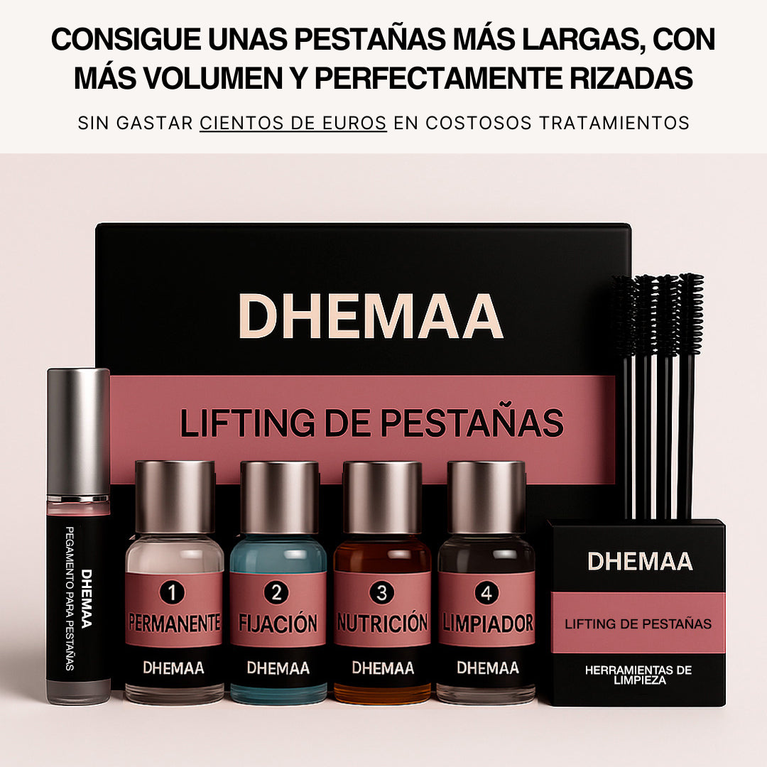 El DHEMAA Set Lifting de Pestañas es un kit casero de lifting de pestañas que se puede usar en casa, como alternativa natural a las pestañas artificiales. Proporciona pestañas con el doble de longitud y densidad, garantizando una elevación impresionante.
